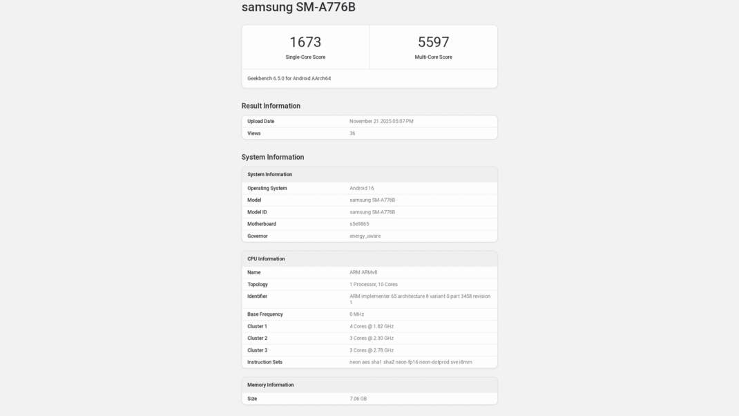 L’appareil a été repéré dans le répertoire de Geekbench par Abhishek, connu pour ses fuites. Cet appareil porte le nom de modèle interne SM-A776B. Il est intéressant de noter qu’il semble fonctionner sur la même plateforme de SoC Exynos 2400. C’est cette même plateforme qui équipe l’actuel Galaxy S25 FE (essai), mais avec un processeur sous-cadencé. Il conserve la configuration du processeur à 10 cœurs et le GPU Adreno 940.