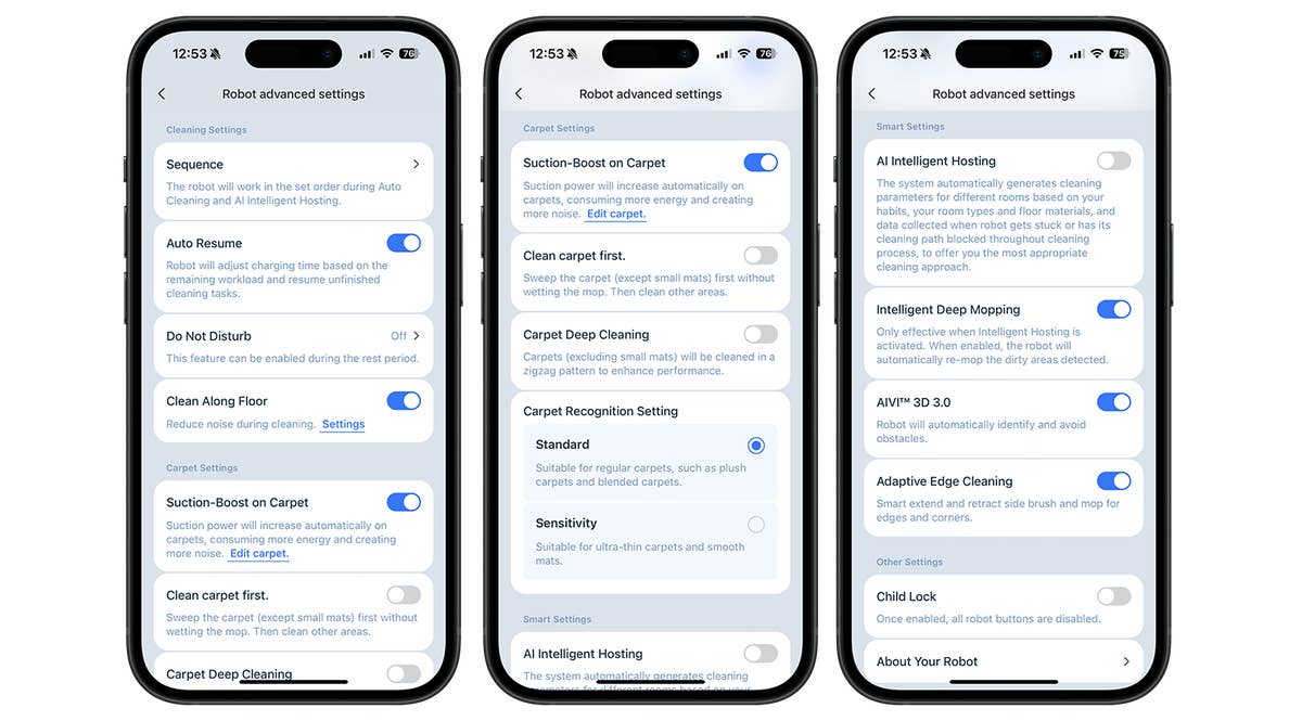J’apprécie particulièrement la diversité des fonctions lorsqu’il s’agit de la gestion des cartes. Ici, le fabricant est au niveau des Roborock et Dreame. Le robot peut nettoyer dans le sens de la pose du sol, ce qui devrait éviter les rayures sur le sol. C’est surtout sur les tapis que l’application Ecovacs Home montre ses points forts. L’application propose trois réglages pour faire passer le nettoyage des tapis au niveau supérieur. Il s’agit de:
