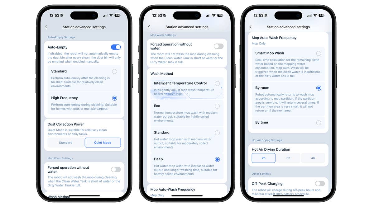 Comme je l’ai déjà mentionné, l’application propose quatre niveaux d’aspiration et 50 débits d’eau. Sur le moment, j’ai été surpris par l’absence de la fonction « Essuyer uniquement ». Mais ce n’est pas grave, car je conseille à tout le monde de faire aspirer son logement avant de penser à l’essuyer.