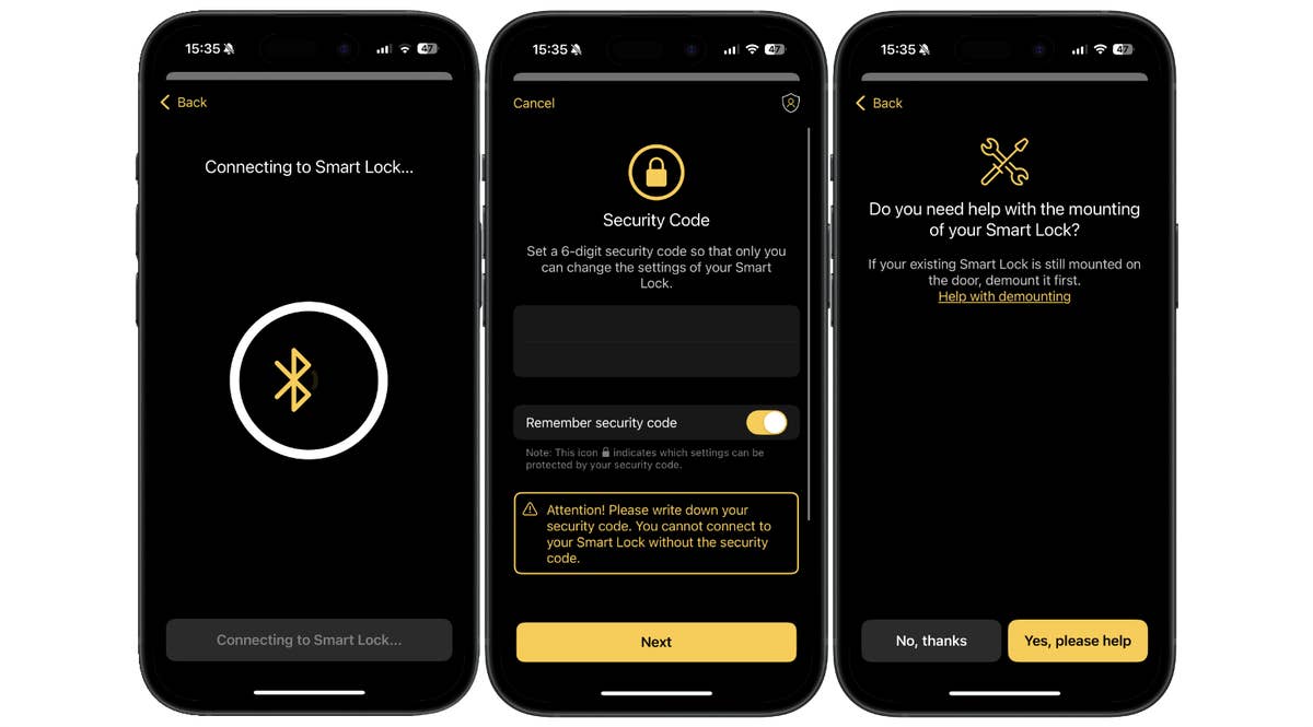 Un conseil avant l’installation: installez l’application avant l’installation. Avant l’installation, établissez une connexion Bluetooth entre le smartphone et la serrure connectée. Ensuite, vous définissez un code de sécurité que vous pouvez enregistrer dans l’application. Ensuite, l’installation commence. L’application vous demande si vous souhaitez être assisté. Faites-moi confiance, acceptez l’aide!
