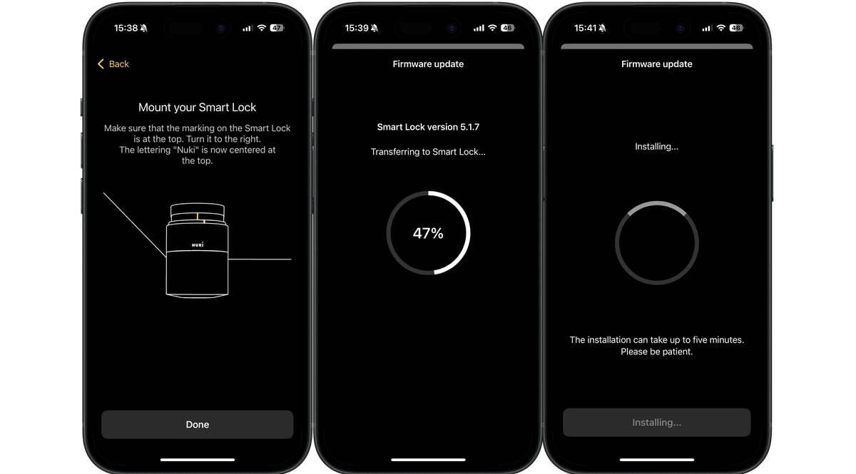 Une fois la plaque en place, on y insère la clé et on y place la serrure connectée. Il ne reste plus qu’à mettre à jour le firmware et la Nuki Smart Lock Pro est prête à l’emploi. L’installation m’a pris environ cinq minutes lors du test pratique.