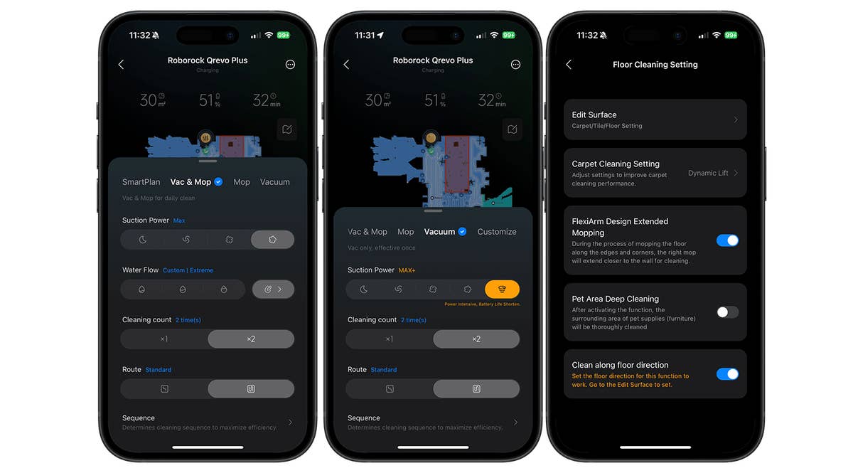 L’utilisation de l’application Roborock est amusante. Elle offre une vue d’ensemble des fonctions de nettoyage et des paramètres de la station d’accueil tout-en-un. Le Qrevo Plus est adapté aux habitations à plusieurs étages.