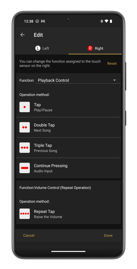 Les commandes tactiles sont très complètes, mais pas assez personnalisables, je trouve. En gros, chaque écouteur peut reconnaître quatre types de commandes tactiles. Chaque type d’appui correspond à une fonction. Et les fonctions sont regroupées en deux catégories. Vous pouvez changer la catégorie pour chaque écouteur. Mais au sein de cette catégorie, les commandes restent les mêmes et restent associées aux mêmes gestes.
