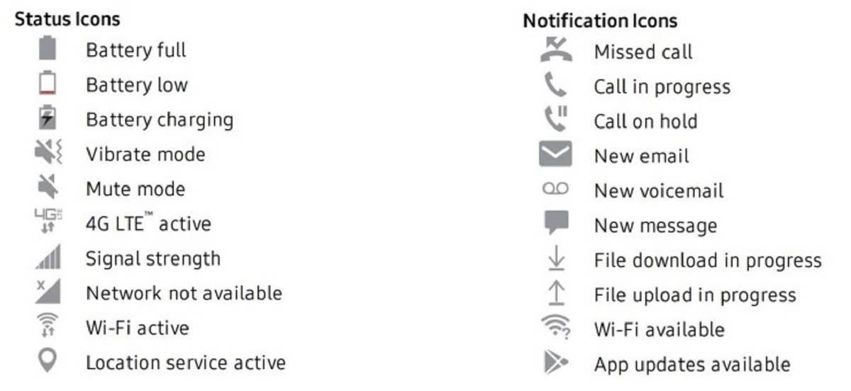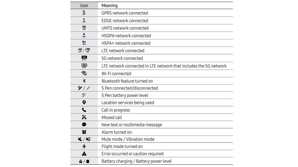 Le manuel d’utilisation de Samsung comprend une liste de symboles qui sont généralement affichés dans la barre de notification des smartphones et Galaxy Tab. Consultez l’image ci-dessous pour voir les plus importants d’entre eux.