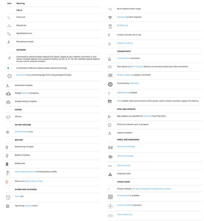 Pour vérifier rapidement de quoi il s’agit, vous pouvez utiliser les liens pour voir si l’icône en question a été répertoriée. Si l’icône que vous recherchez n’est pas répertoriée dans le manuel de votre smartphone, il y a de fortes chances que vous la trouviez sur la page des polices de Google.