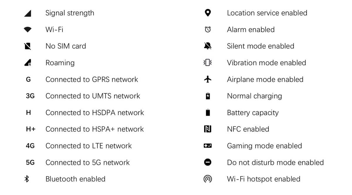 Certaines des icônes que vous rencontrerez sur Android stock sont listées dans l’image ci-dessous. Bien que ces icônes proviennent d’Android 11, la plupart d’entre elles sont restées inchangées sur la dernière version d’Android.